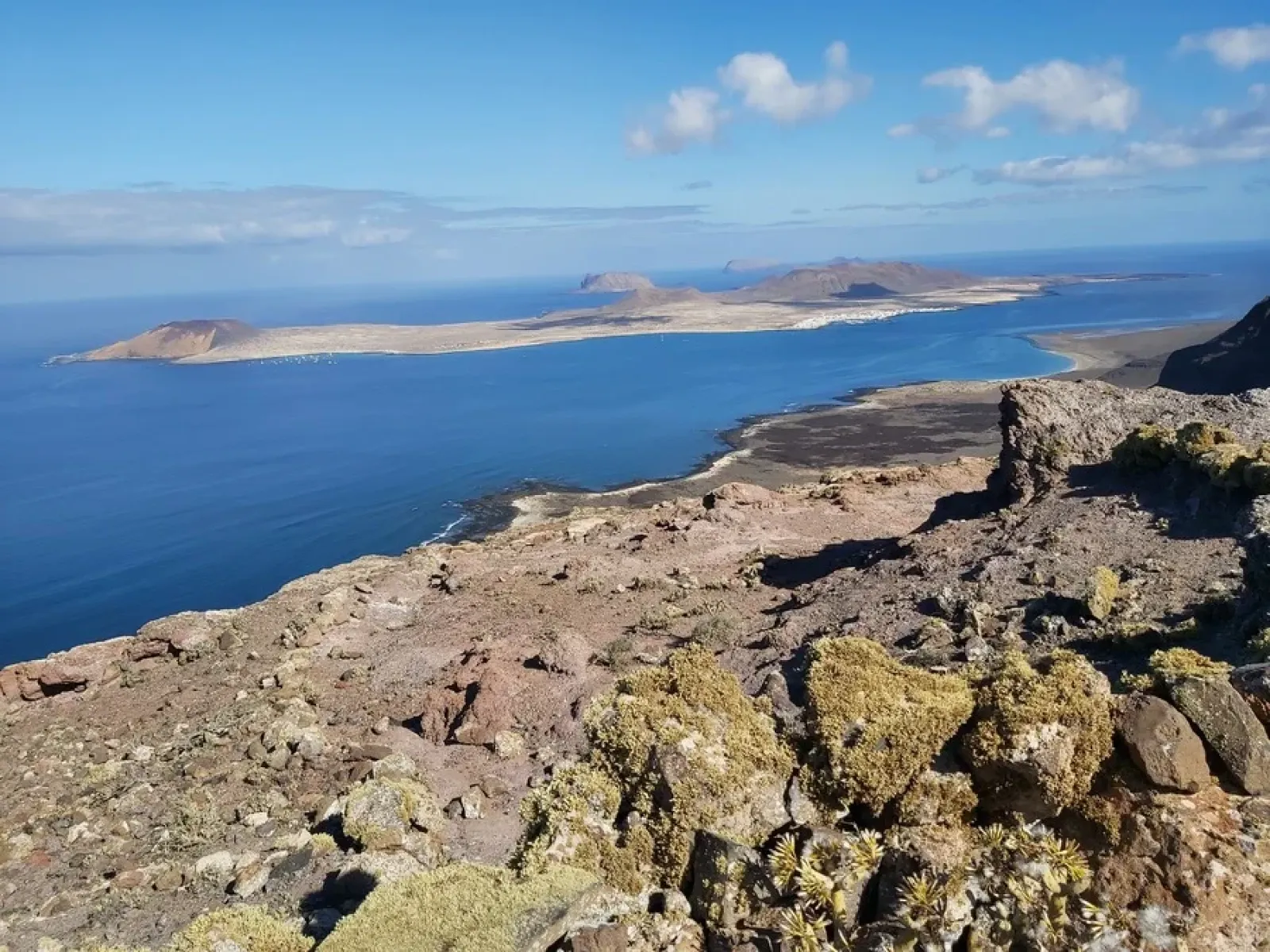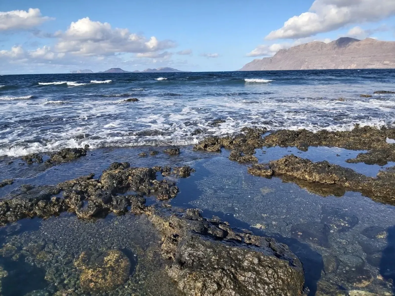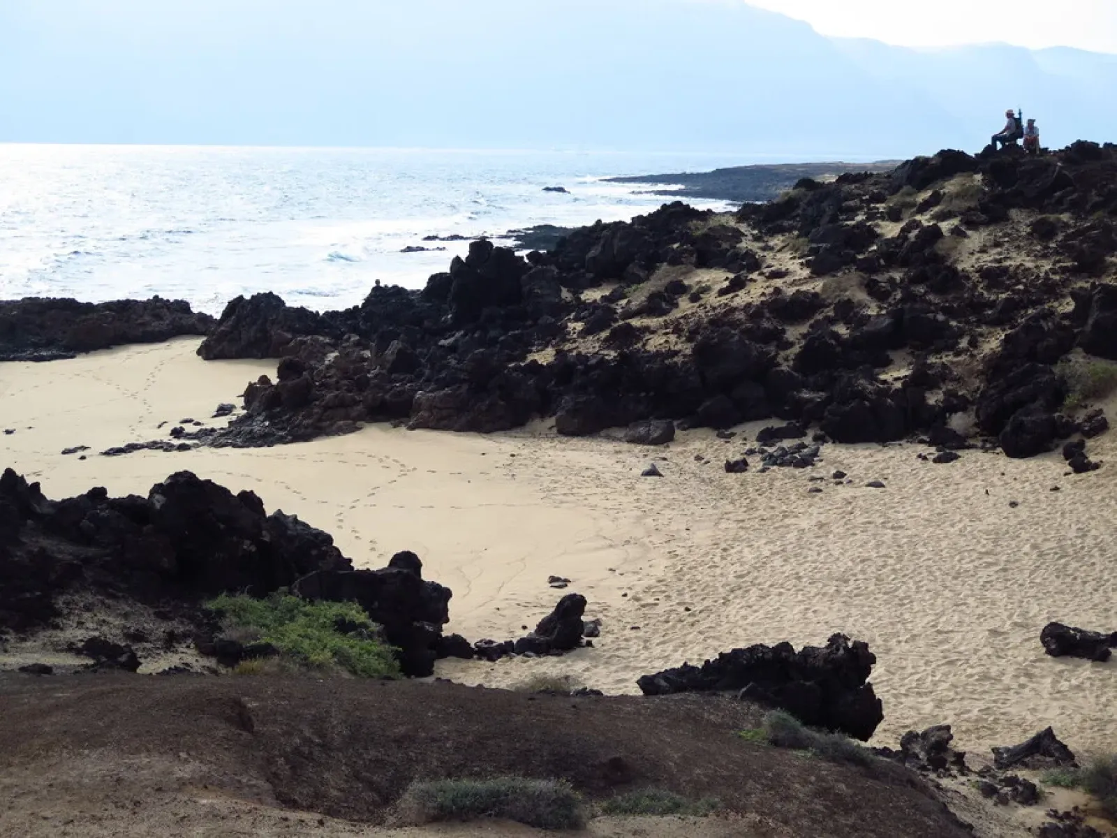 La randonnée débute en bord de mer, avec une vue incroyable sur Lanzarote. Quelques voiliers au large, le Risco de Famara en arrière-plan et l’océan tout autour : le décor est franchement superbe. On longe ensuite longuement la côte sud, entre sable, roches volcaniques et petites plages tranquilles. C’est une marche douce, lumineuse, où l’on prend le temps d’observer les détails, comme ces petits coquillages blancs en forme d’escargot que l’on croise parfois sur le chemin.