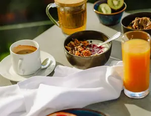 Les petits-déjeuners complets sont de type buffet et proposent un large choix de mets sucrés et salés : crêpes, galettes, cakes maison, far breton...