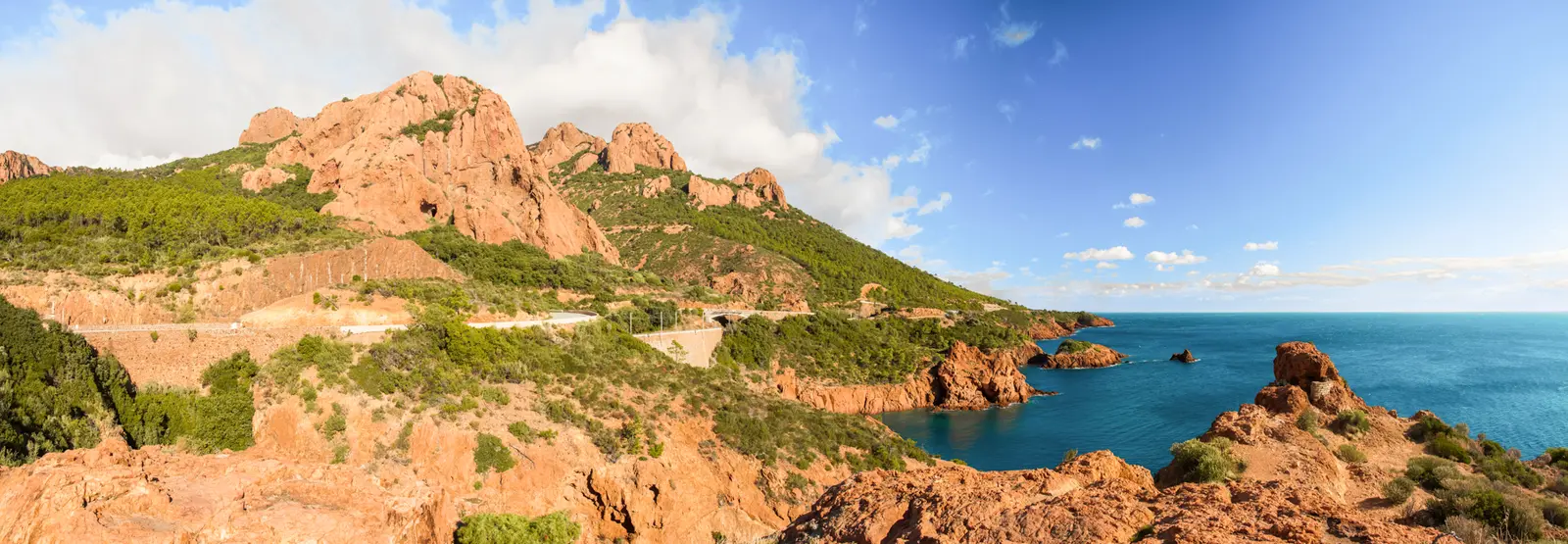 Transfert en taxi pour Agay ( 16 km / 30 minutes). Dernière balade dans le massif en balcon sur la mer et certainement la plus belle. Magnifique itinéraire en crêtes offrant une succession de points de vue sur la Méditerranée, d'abord depuis la table d'orientation sur l'échine du Rastel D'Agay, puis au col du Saint Pilon et au Cap Roux. Ce dernier étant bien nommé car c'est dans cette zone que les rochers qui dominent la mer paraissent les plus rouges, contrastant avec la couleur l'eau et l'écume. Descente dans un cadre montagnard à travers un vaste pierrier puis en longeant le ravin des grenouillets, retour en taxi à l'hôtel depuis le Col de Belle Barbe.