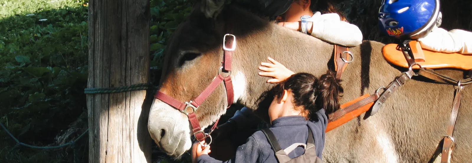 Les ânes sont les complices de vos enfants. Ils les motivent à marcher à leur côté, portent les pique-niques de la journée, se laissent brosser, mener par la bride ou câliner. Ils peuvent porter sur leur dos un jeune randonneur fatigué (enfants de 40 kg maximum), quand le terrain le permet.