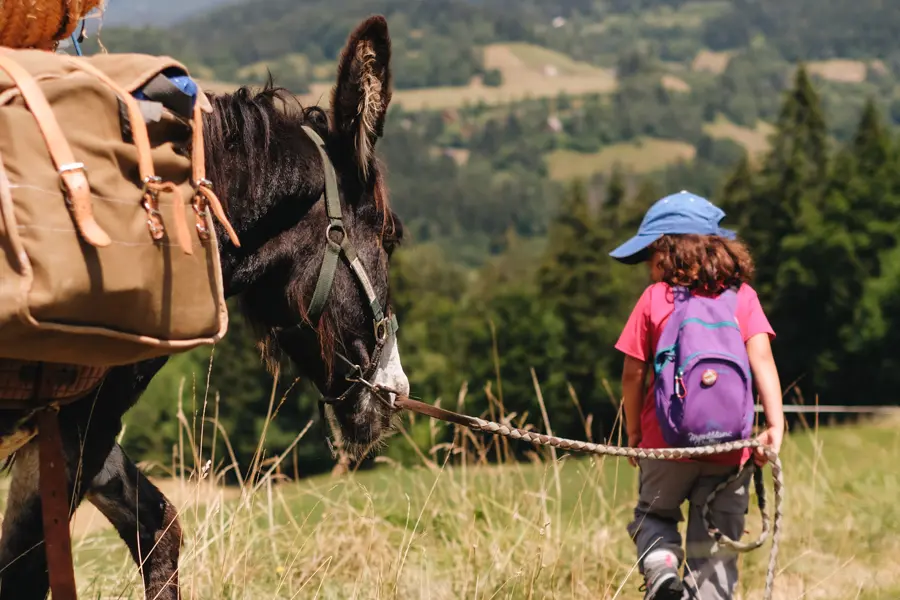 Vous ne portez qu'un sac comportant les affaires pour la journée. Un âne portera le pique-nique (un âne pour 4 enfants). Durant la semaine, nous vous demandons d'avoir un bagage par personne pas trop volumineux (60 cm maximum), dont le poids ne dépasse pas 10 kg. Nous nous déchargeons absolument de toute responsabilité en cas de détérioration de tout objet fragile (ordinateur portable, par exemple).