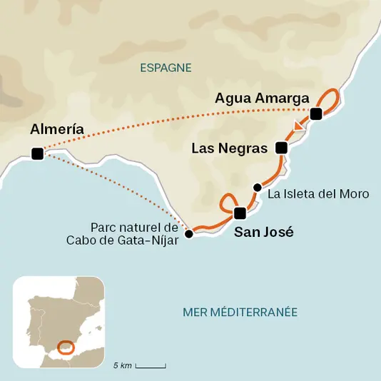 Au départ d'Agua Amarga, après un passage dans l'arrière pays, la randonnée arrive à la belle plage de Cala del Plomo. Suit un magnifique sentier avec une dernière partie en balcon 250 m au-dessus de la mer. La traversée de la baie édénique de San Pedro avec sa fontaine et son village hippie restera comme un moment fort de ce voyage avant de rejoindre Las Negras.