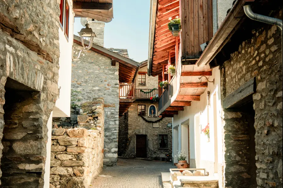 Montée au hameau de Sécheron puis passage par celui d'Armina. Poursuite le long du sentier balcon du Mont de la Saxe qui se tient face au Mont-Blanc ou montée par le col du Sapin. Descente à Courmayeur, village thermal italien, jusqu'à la gare routière pour un court transfert en bus jusqu'au refuge de Monte Bianco.