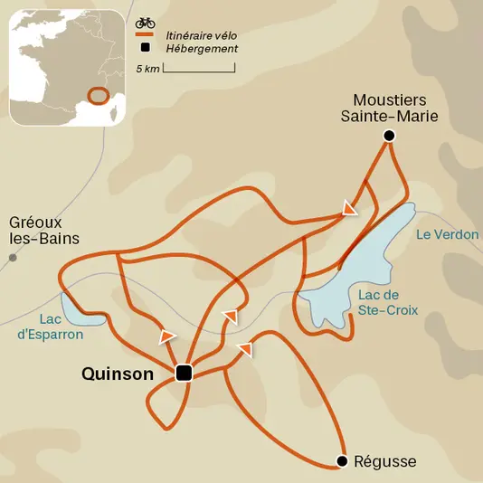 Accueil dans l'après-midi à votre hébergement non loin de Quinson. Installation à votre hébergement avec vos vélos.