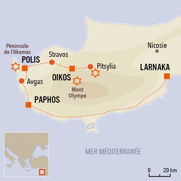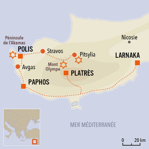 La péninsule d’Akamas, ses sentiers rocheux et le sentier d’Aphrodite permettent d’admirer les falaises et les roches sculptées du littoral. L'arrière-pays et les montagnes de Chypre amèneront les randonneurs dans le massif de Troodos avec ses beaux sentiers, ses crêtes et ses superbes panoramas. La visite de la capitale Nicosie, ville aux deux visages, finira le séjour en beauté.