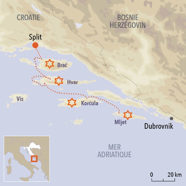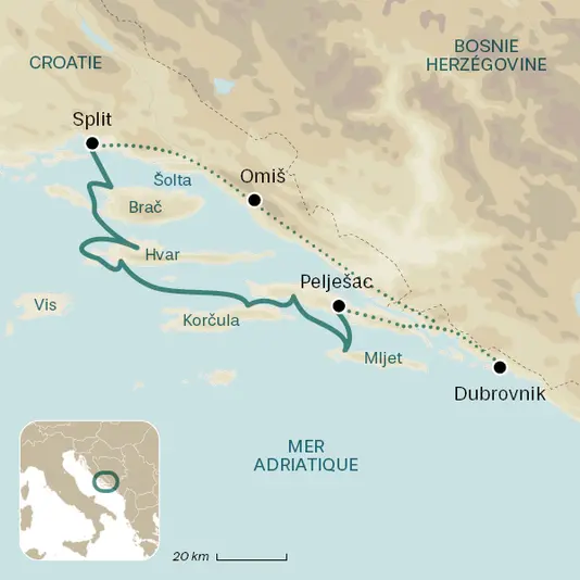 À pied, en vélo ou en goélette, la visite des îles Dalmates ravira les randonneurs à la recherche de paysages variés et d'une nature préservée : montagnes, criques, canyons, forêts, garrigue colorée et plages aux galets ronds. Les sentiers aux bords de l’eau permettront de découvrir les îles de Hvar, Brac, Vis, Korcula ou encore Mljet. La côte Dalmate dispose également de magnifiques villes avec de vrais bijoux architecturaux : Trogir, Split et Dubrovnik.