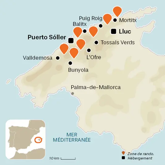 Majorque, la plus grande île des Baléares, est une destination regorgeant de recoins secrets, d'un massif montagneux, et d’une nature sauvage et authentique. La chaine de la Sierra de Tramuntana offre des paysages et des décors variés sur toute la côte ouest et le nord de l’île : majestueuses falaises calcaires, mer turquoise, montagnes vertes et ocres, vergers en terrasses... La découverte de Majorque sera également rythmée par l’alternance de villages typiques et pittoresques comme Sóller.