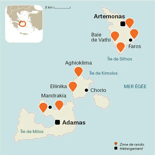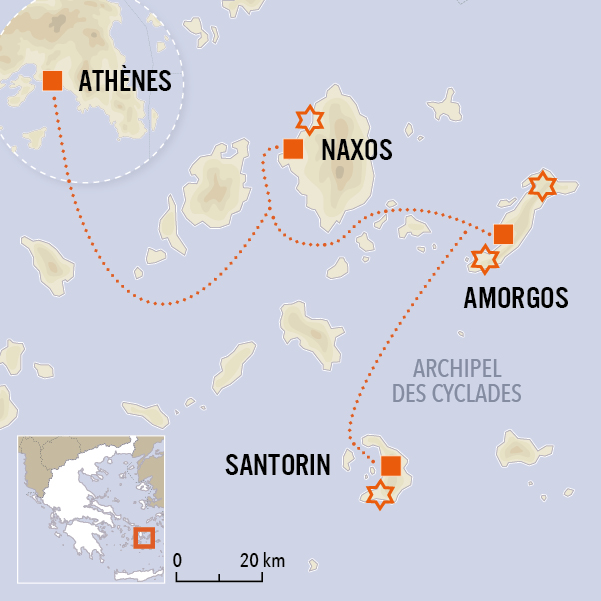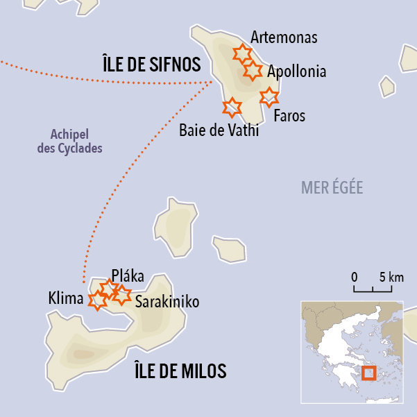 À l'Est, l’archipel des Cyclades avec sa multitude d’îles, Santorin, Amorgos, Naxos, Milos, Sérifos et Milos, et l’archipel du Dodécanèse, offrent de magnifiques criques et une végétation méditerranéenne. À l'Ouest, les îles Ioniennes, dont Corfou l’île principale, recèlent de superbes paysages montagneux, d'imposantes falaises et des magnifiques plages. La Crète, cinquième île de la Méditerranée, regorge de sites mythiques : gorges de Samaria, palais de Knossos, presqu’île d’Elafonissi…