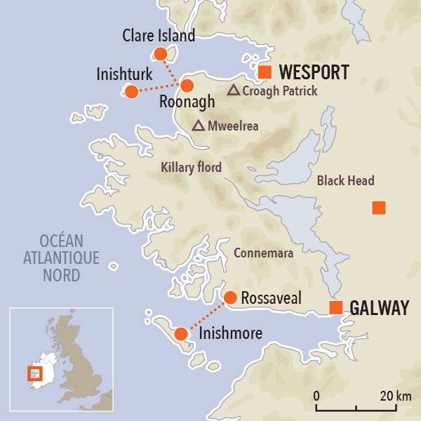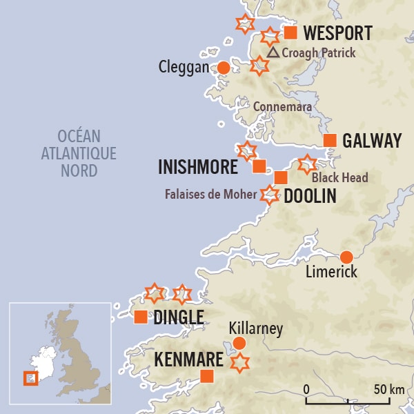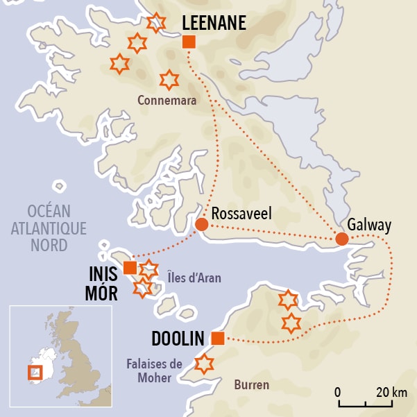 Le Connemara, territoire des lacs, des landes, des tourbières et des montagnes, offre des randonnées au coeur d'une nature resplendissante. L’archipel des îles d’Aran avec son incroyable réseau de murets de pierres et ses forts millénaires, et le Burren avec son immense plateau calcaire, séduiront les randonneurs. Dublin, ville cosmopolite à taille humaine, permettra aux visiteurs de prendre le temps de flâner.