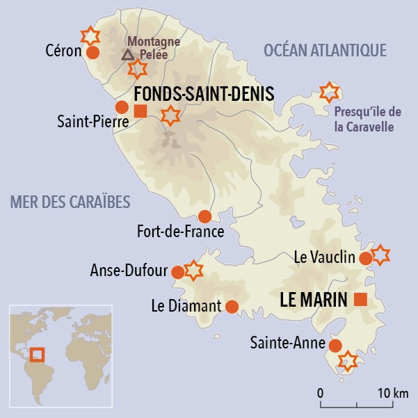 Au nord de l’île se dresse l’imposante montagne Pelée. L’activité volcanique a façonné ce territoire et donne aux marcheurs du monde entier l’occasion de découvrir de superbes panoramas. Au centre, sur la côte Est, la Presqu’île de la Caravelle permet de découvrir une nature préservée et de très jolies mangroves. Au sud, après Fort-de-France, les plages s’allongent, et les côtes de l’Atlantique et des Caraïbes s’ouvrent sur d’impressionnants lagons.