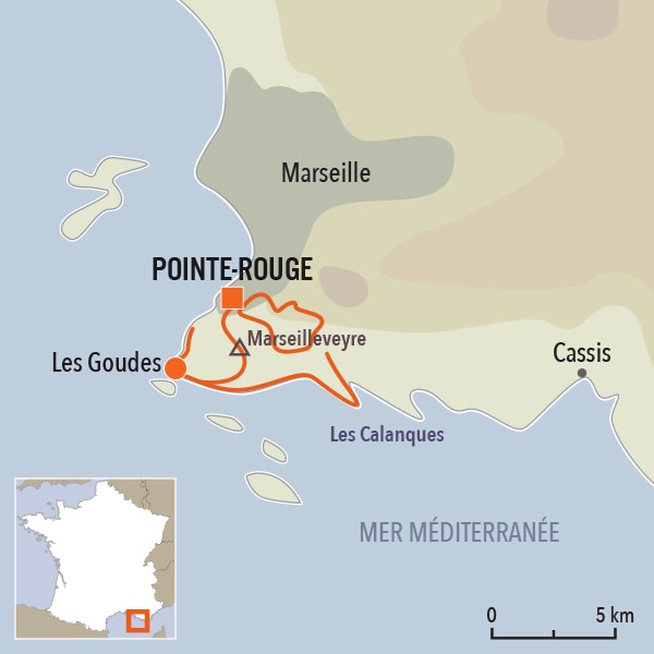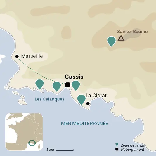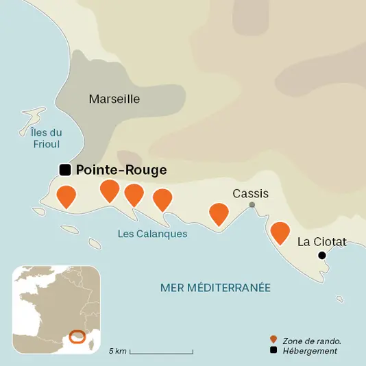 Bercés dans un univers de garrigue parfumé, les marcheurs découvrent les plus belles calanques, En Vau, Port-Pin, Port-Miou, Morgiou, Sugiton, Sormiou… Ils profitent également du massif de Marseilleveyre et du Cap Canaille, les plus hautes falaises d’Europe. Soleil, mer turquoise, petites criques, calcaire blanc, découverte de la faune et de la flore rythment les randonnées dans ce lieu envoûtant.